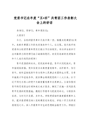 党委书记在年度“五•四”共青团工作表彰大会上的讲话.docx