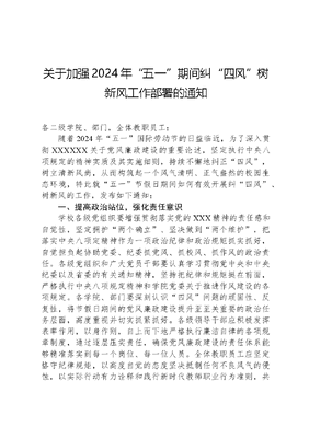 关于加强2024年“五一”期间纠“四风”树新风工作部署的通知.docx
