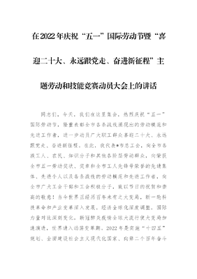 在2022年庆祝“五一”国际劳动节暨“喜迎二十大、永远跟党走、奋进新征程”主题劳动和技能竞赛动员大会上的讲话.docx