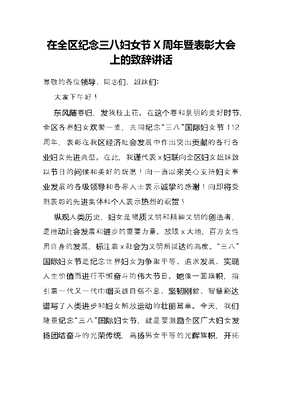 在全区纪念三八妇女节X周年暨表彰大会上的致辞讲话.docx