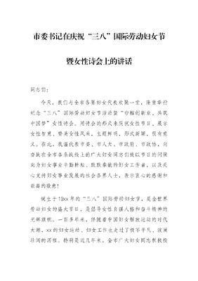市委书记在庆祝“三八”国际劳动妇女节暨女性诗会上的讲话.docx