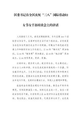 区委书记在全区庆祝“三八”国际劳动妇女节女干部座谈会上的讲话.docx
