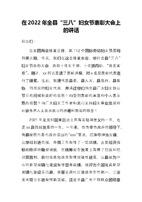 在2022年全县“三八”妇女节表彰大会上的讲话.docx