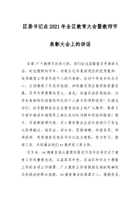 区委书记在2021年全区教育大会暨教师节表彰大会上的讲话.docx