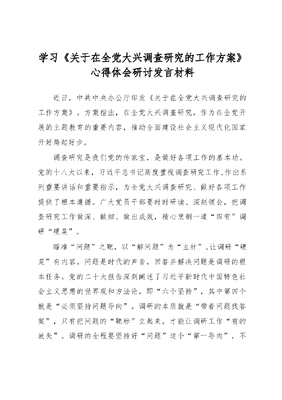 学习《关于在全党大兴调查研究的工作方案》心得体会研讨发言材料.docx