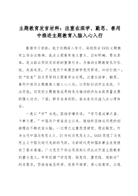 主题教育发言材料:注重在深学、勤思、善用中推进主题教育入脑入心入行.docx
