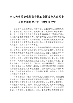 市人大常委会党组副书记在全国省市人大常委会负责同志学习班上的交流发言.docx