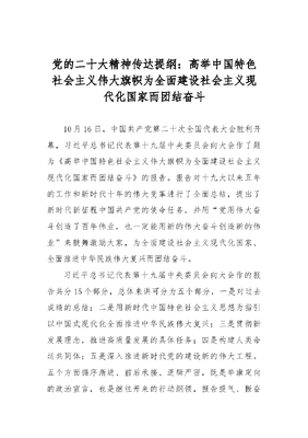 党的二十大精神传达提纲:高举中国特色社会主义伟大旗帜为全面建设社会主义现代化国家而团结奋斗.docx