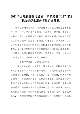 2023年主题教育研讨发言:牢牢把握“12”字总要求修好主题教育这门必修课.docx