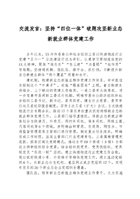 交流发言:坚持“四位一体”破题攻坚新业态新就业群体党建工作.docx