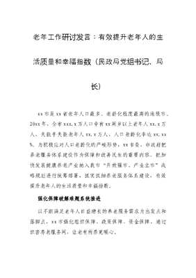 老年工作研讨发言:有效提升老年人的生活质量和幸福指数(民政局党组书记、局长).docx