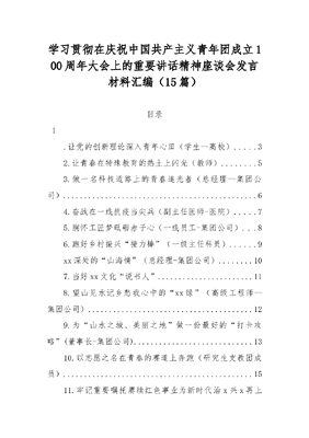 (15篇)学习贯彻在庆祝中国共产主义青年团成立100周年大会上的重要讲话精神座谈会发言材料汇编.docx