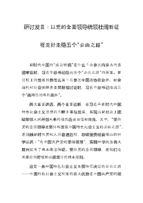 研讨发言:以党的全面领导统领壮阔新征程 走好走稳五个“必由之路”.docx