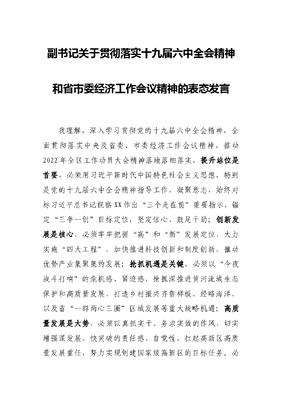 副书记关于贯彻落实十九届六中全会精神和省市委经济工作会议精神的表态发言.docx