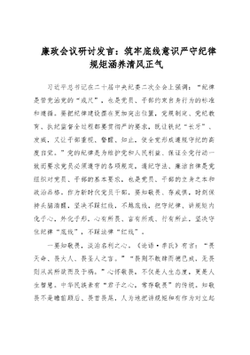 廉政会议研讨发言:筑牢底线意识严守纪律规矩涵养清风正气.docx