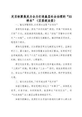政治工作交流发言定目标聚焦发力 全力打造基层社会治理的XX样本:区委政法委.doc