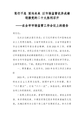 笃行不怠 面向未来 以市场监管优异成绩迎接党的二十大胜利召开——在全市市场监管工作会议上的报告.docx