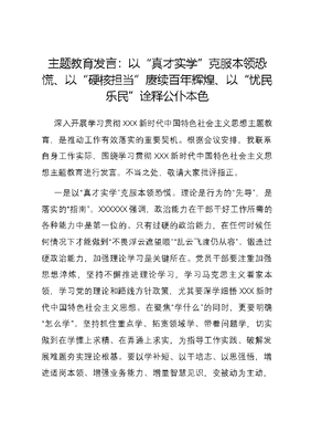 主题教育发言:以“真才实学”克服本领恐慌、以“硬核担当”赓续百年辉煌、以“忧民乐民”诠释公仆本色.docx