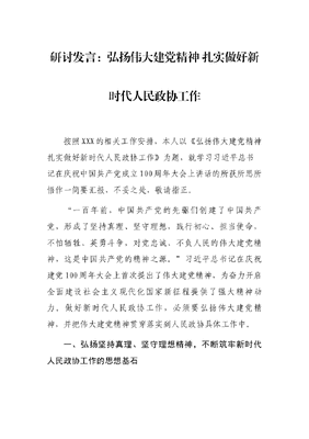 研讨发言:弘扬伟大建党精神 扎实做好新时代人民政协工作.docx