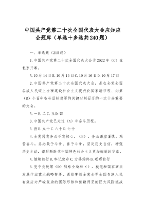 (240题)中国共产党第二十次全国代表大会应知应会题库.docx