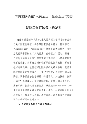 消防支队长在“人民至上、生命至上”党委议防工作专题会上的发言.docx