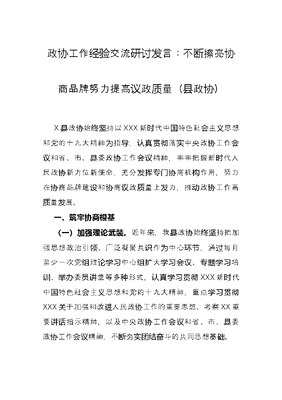 政协工作经验交流研讨发言:不断擦亮协商品牌 努力提高议政质量(县政协).docx