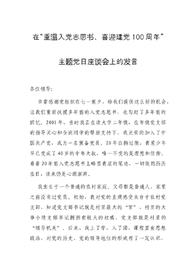 在“重温入党志愿书、喜迎建党100周年”主题党日座谈会上的发言.docx