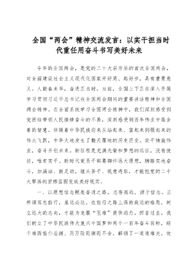 全国“两会”精神交流发言:以实干担当时代重任用奋斗书写美好未来.docx