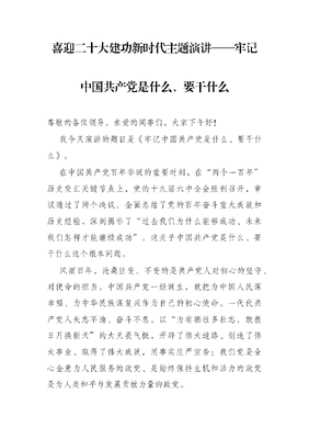 喜迎二十大建功新时代主题演讲——牢记中国共产党是什么、要干什么.docx