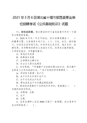 2021年3月6日湖北省十堰市郧西县事业单位招聘考试《公共基础知识》试题.docx