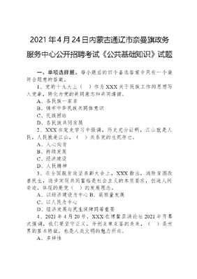 2021年4月24日内蒙古通辽市奈曼旗政务服务中心公开招聘考试《公共基础知识》试题.docx
