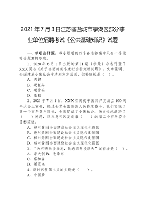2021年7月3日江苏省盐城市亭湖区部分事业单位招聘考试《公共基础知识》试题.docx
