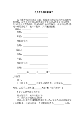 个人股份转让协议书范本.doc