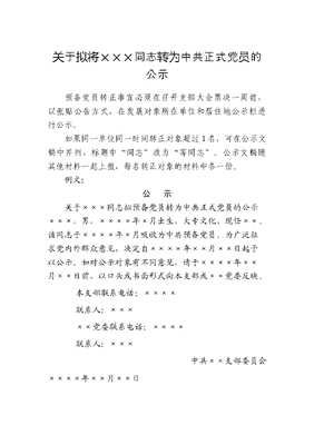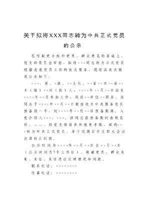 关于拟将XXX同志转为中共正式党员的公示.doc