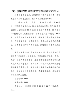 关于拟将XX同志确定为发展对象的公示.doc