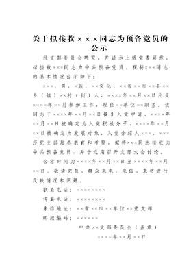 关于拟接收×××同志为预备党员的公示.doc
