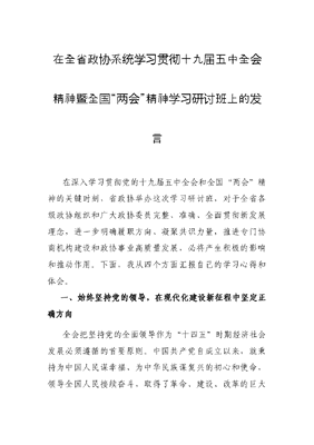 在全省政协系统学习贯彻十九届五中全会精神暨全国“两会”精神学习研讨班上的发言.docx