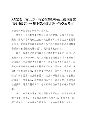 XX党委(党工委)书记在2023年第二批主题教育9月份第一次集中学习研讨会上的交流发言.docx