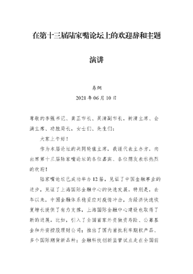 易纲在第十三届陆家嘴论坛上的欢迎辞和主题演讲.docx