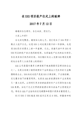 在XXX项目投产仪式上的致辞.doc