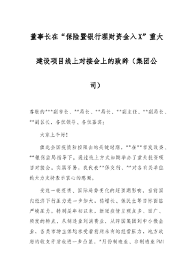 董事长在“保险暨银行理财资金入X”重大建设项目线上对接会上的致辞(集团公司).docx
