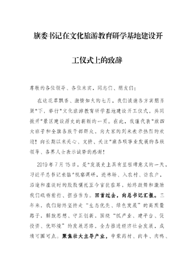 旗委书记在文化旅游教育研学基地建设开工仪式上的致辞.docx