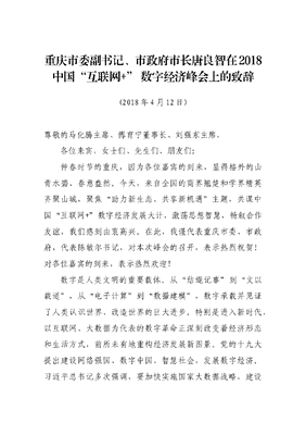 重庆市委副书记、市政府市长唐良智在2018中国“互联网+” 数字经济峰会上的致辞.docx
