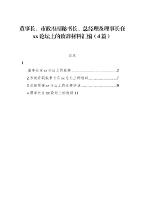 (4篇)董事长、市政府副秘书长、总经理及理事长在xx论坛上的致辞材料汇编.docx
