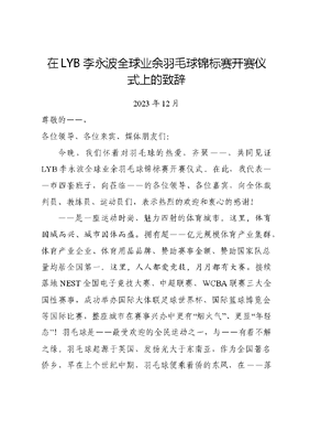 LYB李永波全球业余羽毛球锦标赛开赛仪式上的致辞.doc