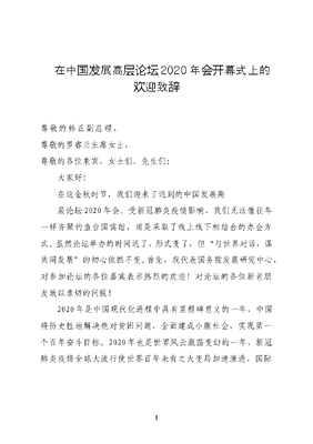 国务院发展研究中心副主任马建堂在中国发展高层论坛2020年会开幕式上的欢迎致辞.doc