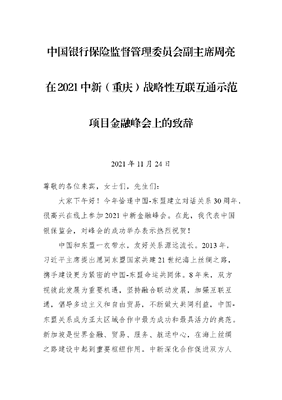 中国银行保险监督管理委员会副主席周亮在2021中新(重庆)战略性互联互通示范项目金融峰会上的致辞.docx