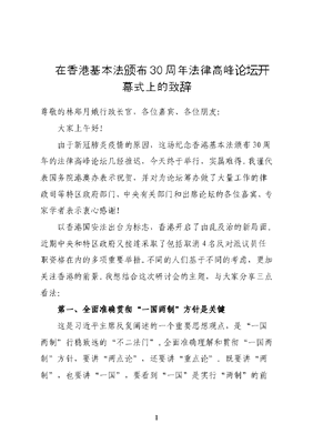 国务院港澳事务办公室副主任张晓明在香港基本法颁布30周年法律高峰论坛开幕式上的致辞.doc