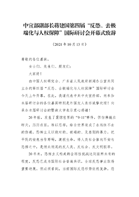 中宣部副部长蒋建国第四届“反恐、去极端化与人权保障”国际研讨会开幕式致辞.docx