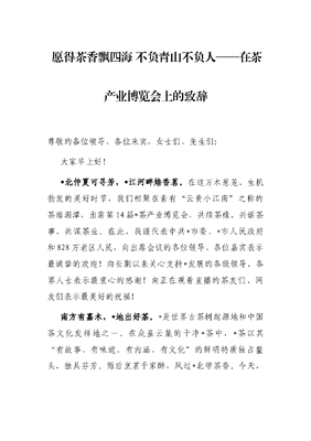 愿得茶香飘四海 不负青山不负人——在茶产业博览会上的致辞.docx